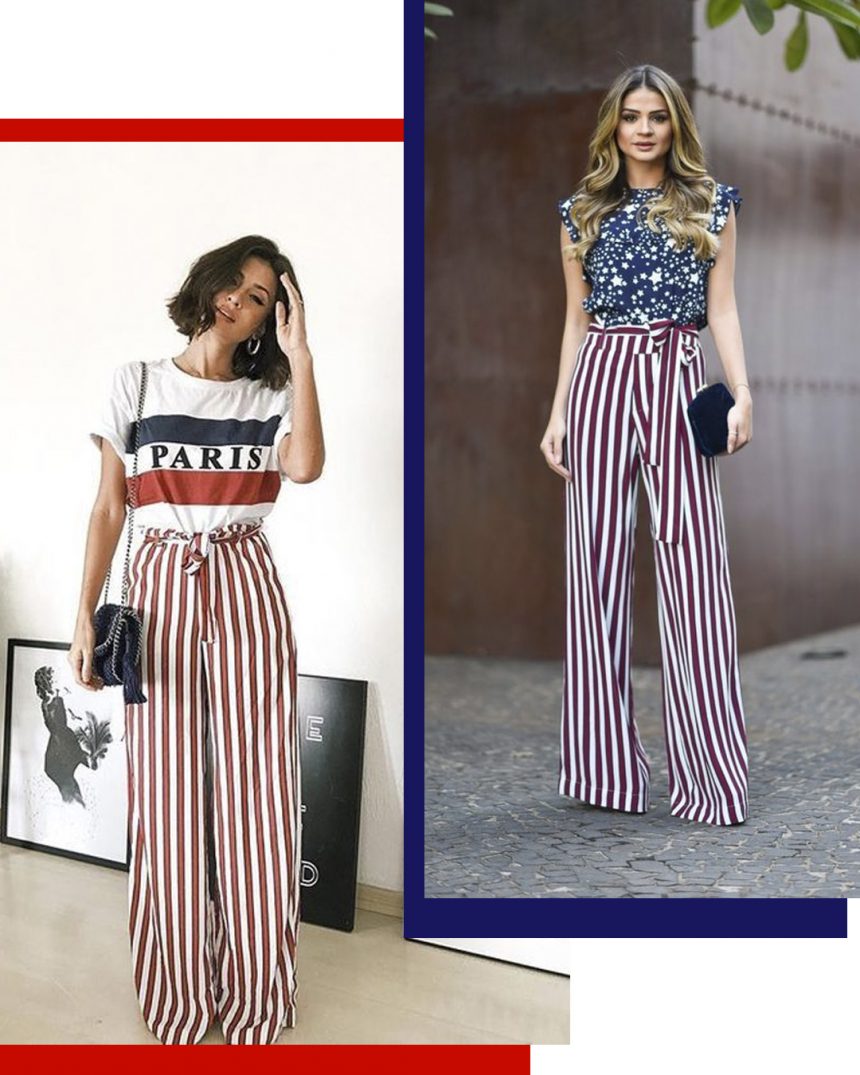 Olha que lindo! Calça listrada vermelha com a parte de cima Azul e branca. Quero uma calça dessa logo!