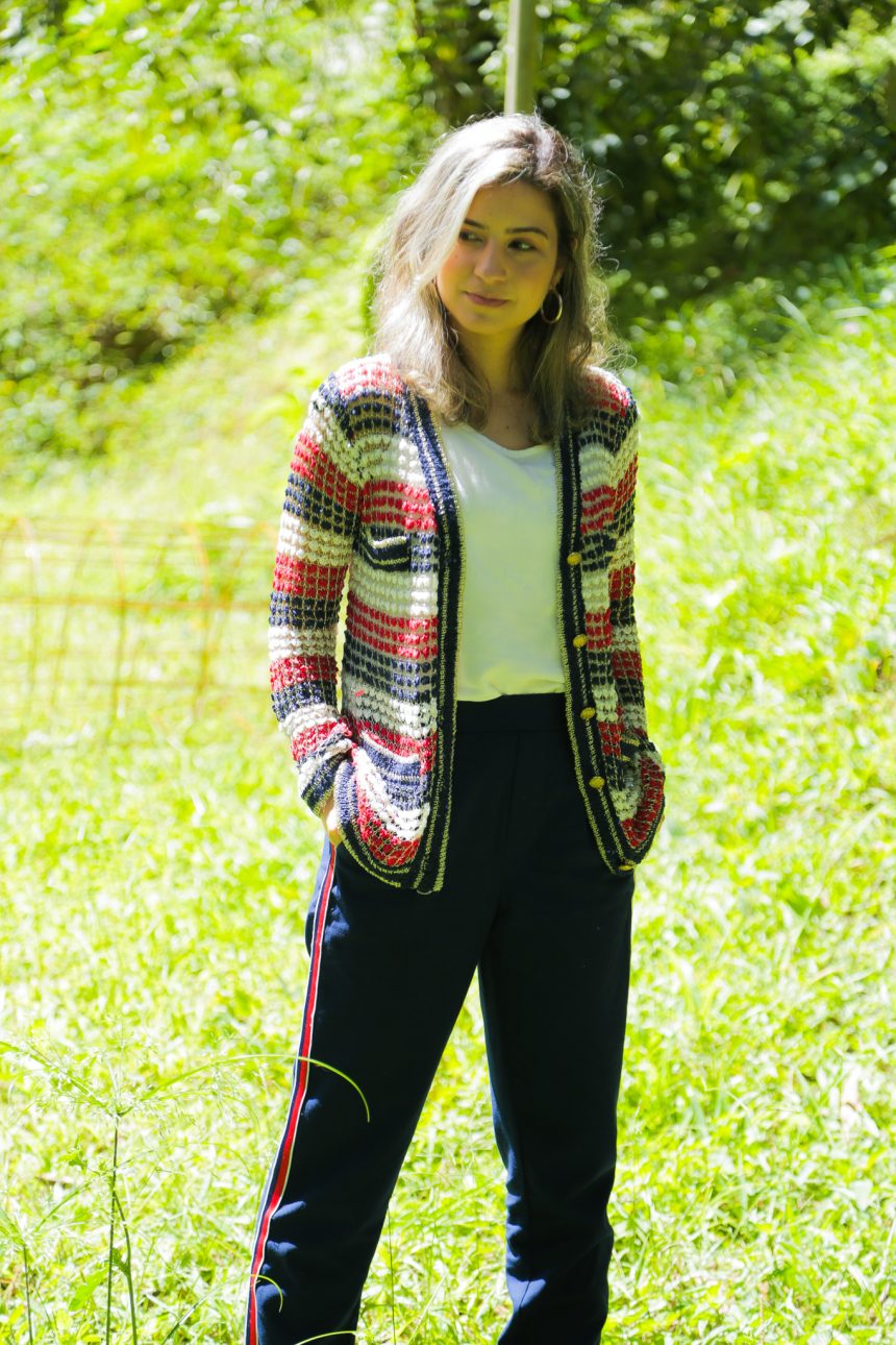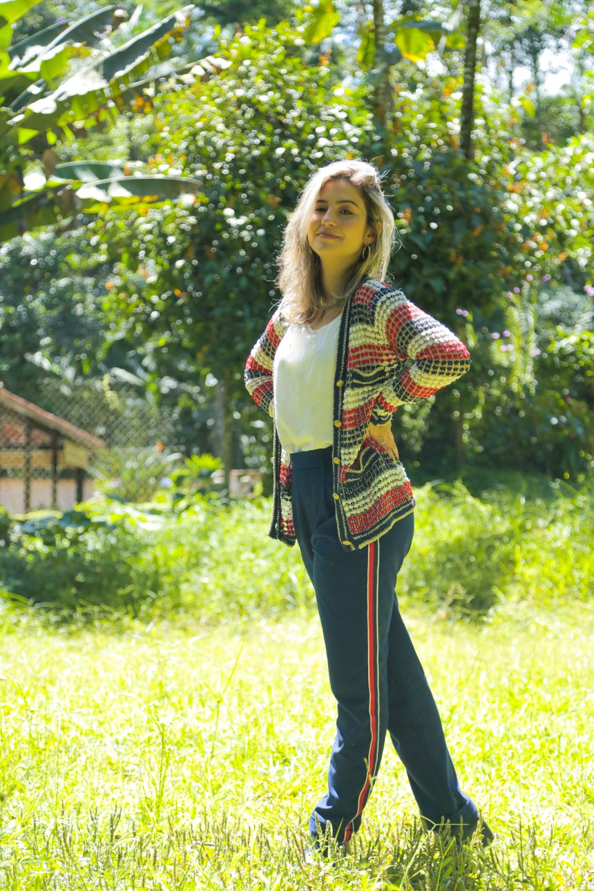 Minhas escolha foi uma calça azul com listras vermelhas nas laterais, da Forever 21, Casaco comprado há anos no Bom retiro e uma regata branca que eu amo da Salinas.