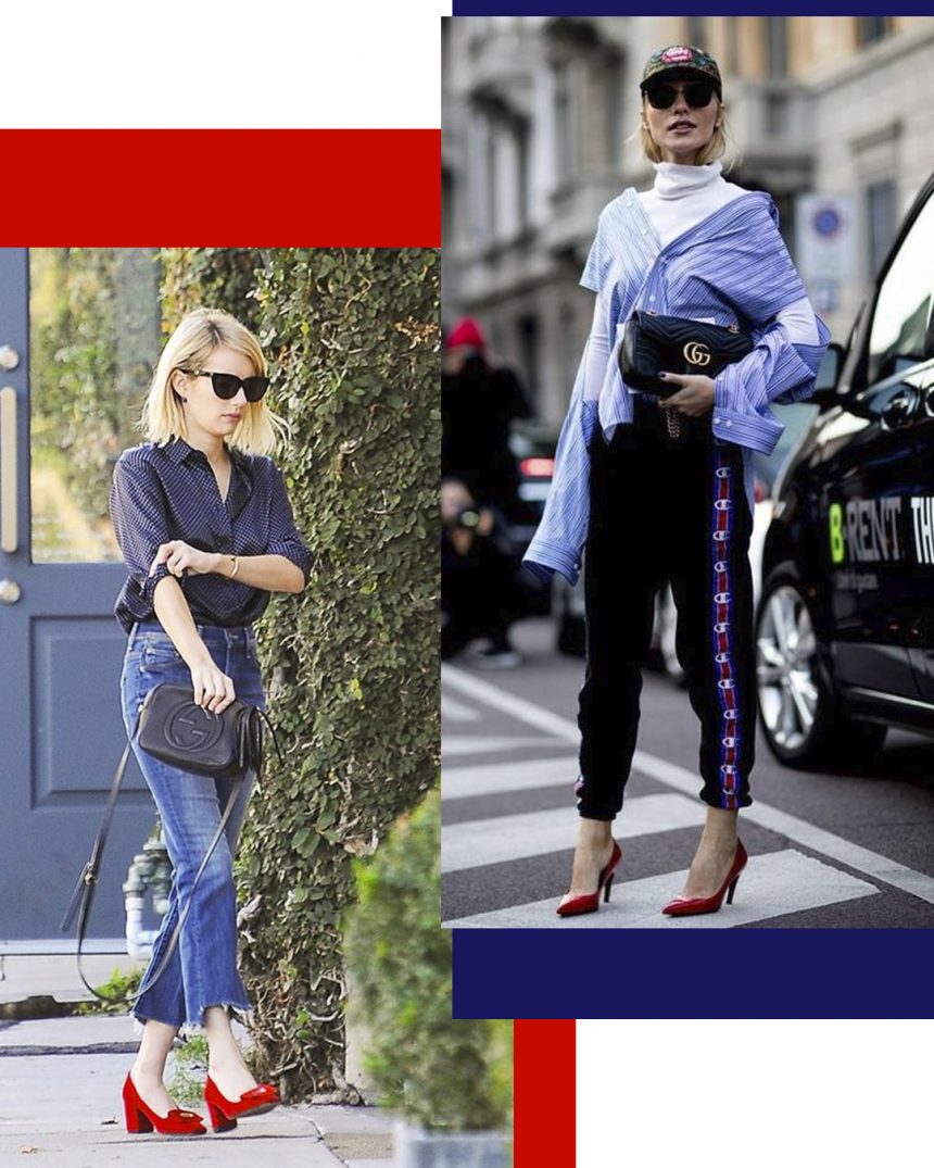 Para quem ainda tem medo de abusar nas cores vai uma referência mais “básica”: Look todo azul com os sapatos vermelhos.