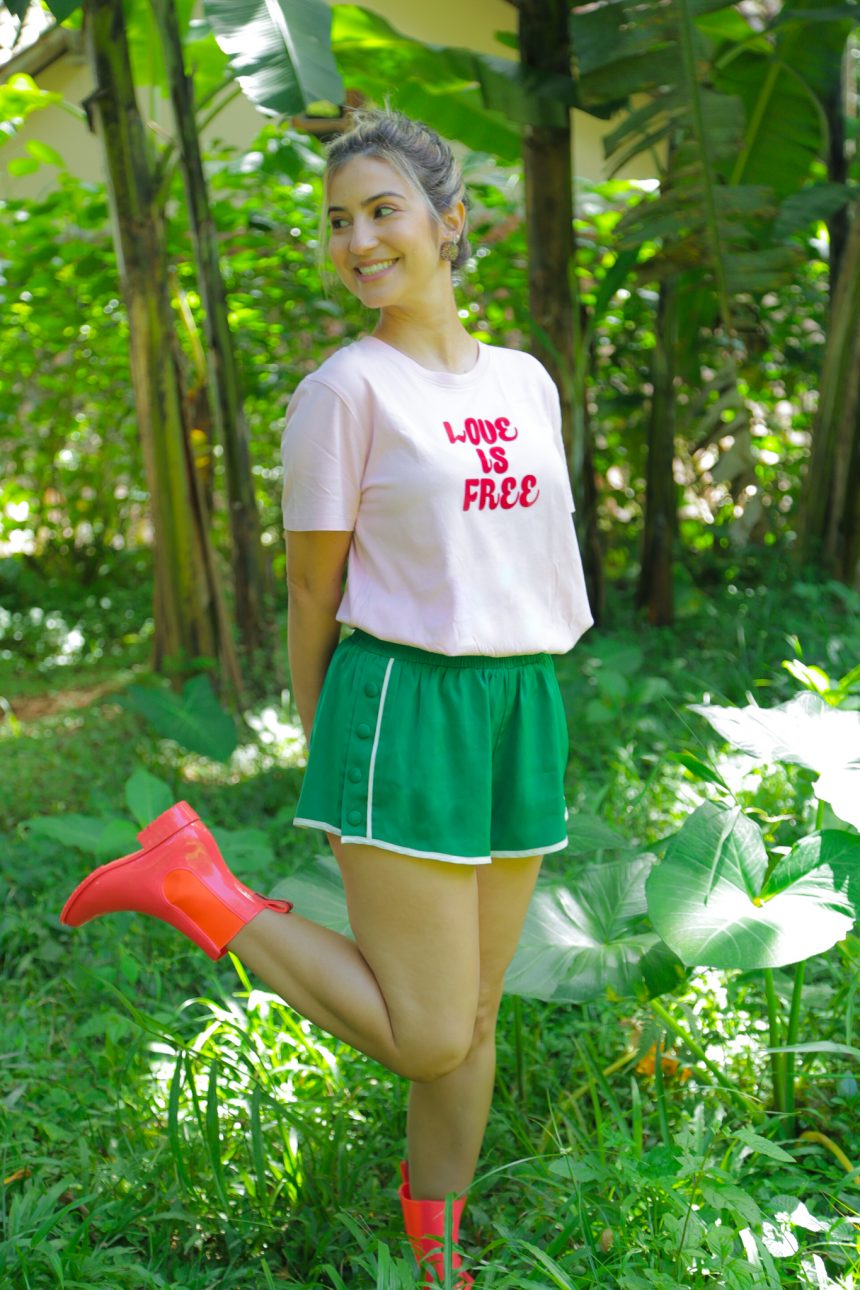 O meu look está bem menininha do mato despojada.Rs. Com minha galocha de mertiolate, como meu ex-chefe chamava. Como eu amo essa galocha! Cheguei? Imagina! Não basta só o look verde e rosa que ainda queremos colocar mais cor.