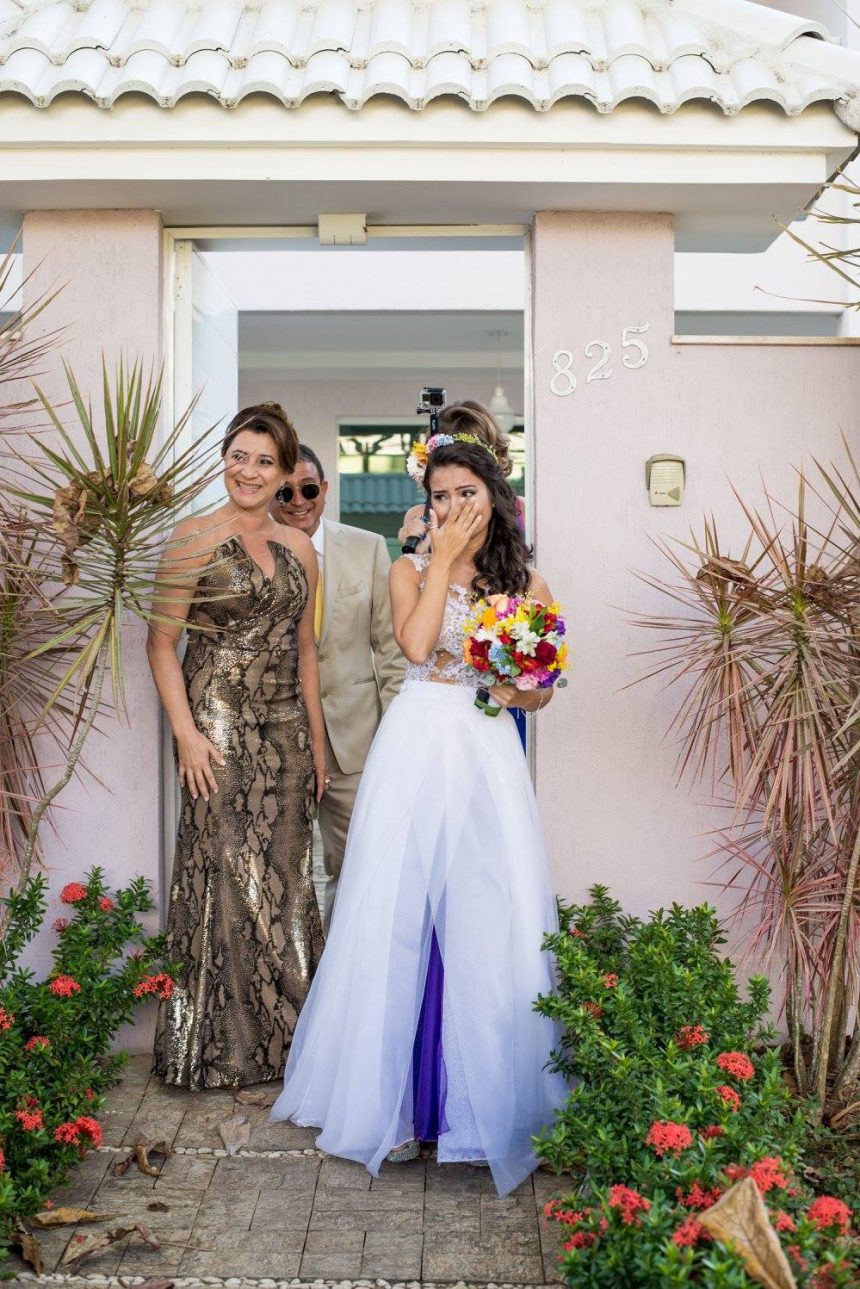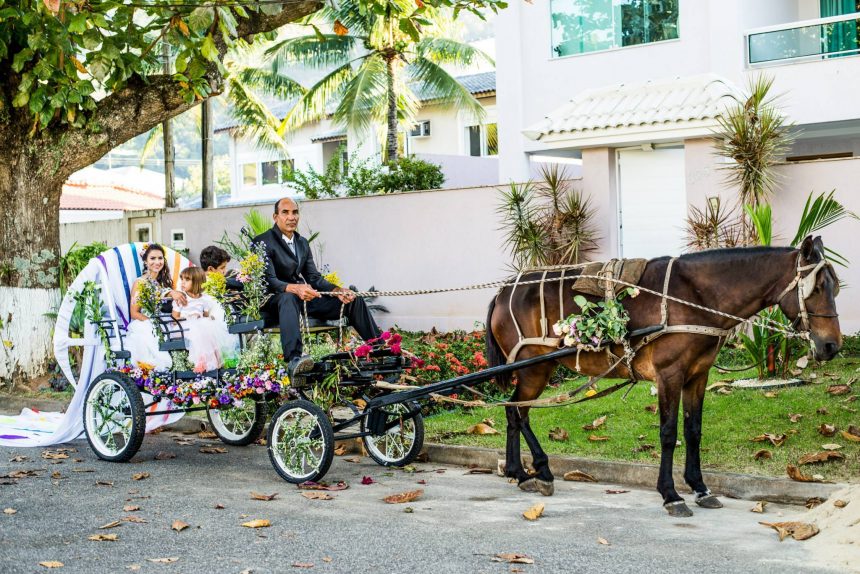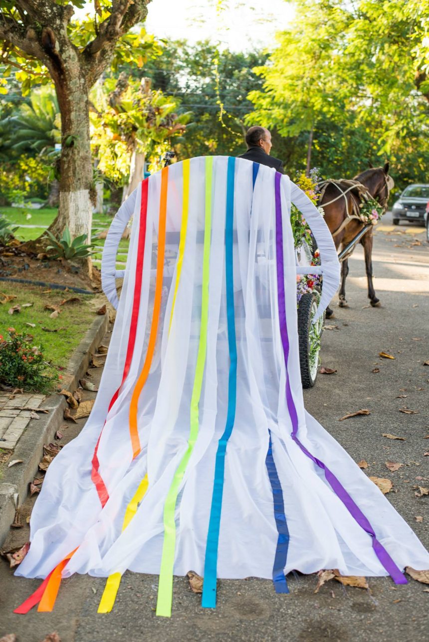 Essa parte colorida nem eu esperava! Foi um presente dos meus pais. Sempre sonhei em chegar de charrete, mas por casar em uma casa de festa não acreditava que seria possível. Mas não é que para os meu pais isso não foi um empecilho?